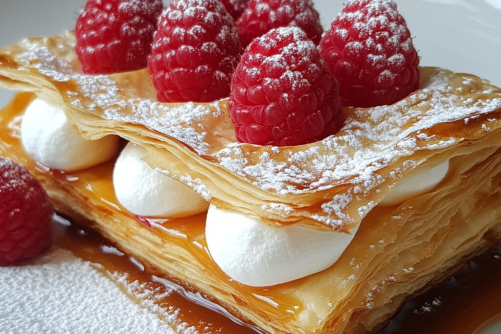 The Feuilletés aux Guimauves, Framboises et Caramel is a delightful dessert that brings together the sweet flavors of marshmallows, tart raspberries, and rich caramel. This treat is not only visually impressive but also offers a delightful blend of textures and tastes. Perfect for any occasion, it showcases how simple ingredients can come together to create a memorable dessert experience.