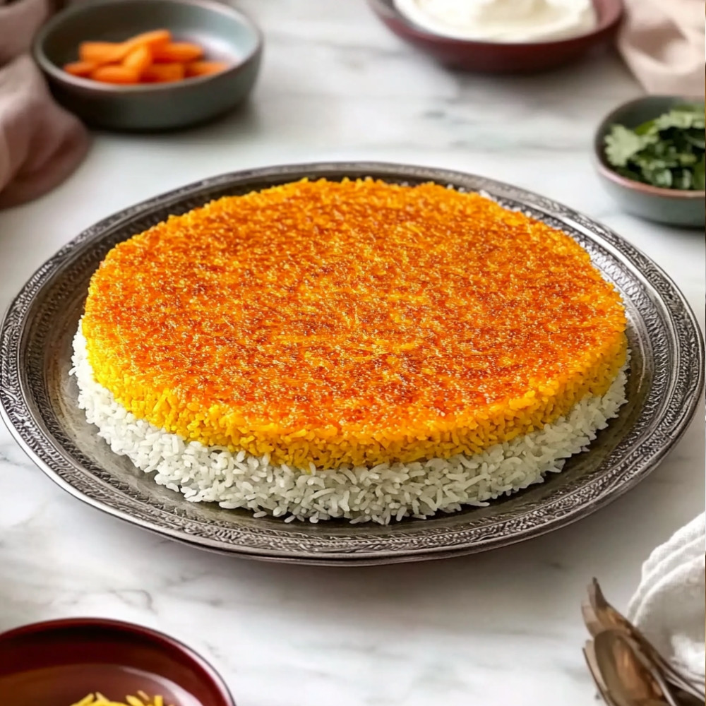 To serve, invert the pot onto a large serving platter. Carefully lift the pot off to reveal the crispy tahdig on the bottom.