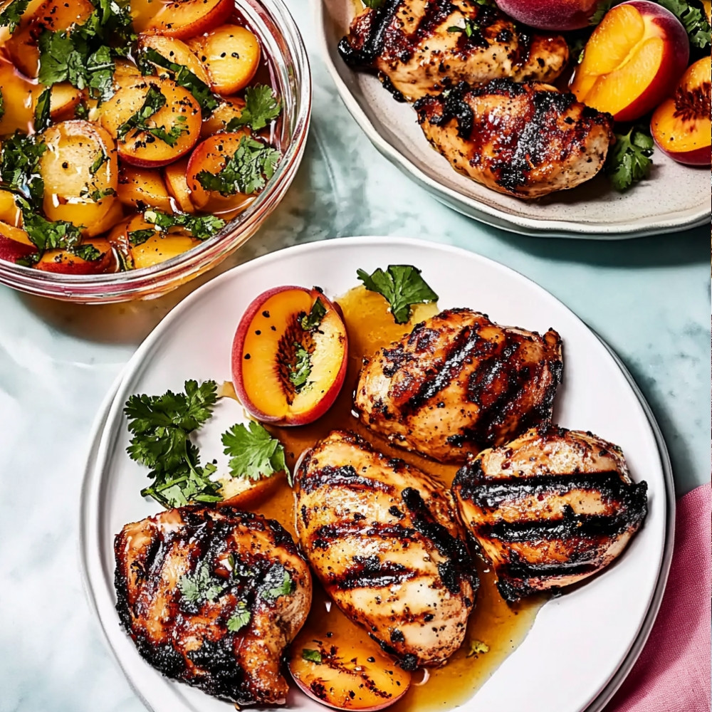 A refreshing salad featuring ripe peaches, peppery arugula, and a light vinaigrette can beautifully contrast the richness of the grilled chicken while adding a touch of freshness.
