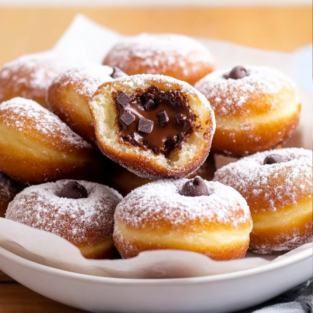 While the doughnuts are still warm, use a piping bag to fill each doughnut with chocolate filling. You can make a small hole on the side of each doughnut to inject the filling.