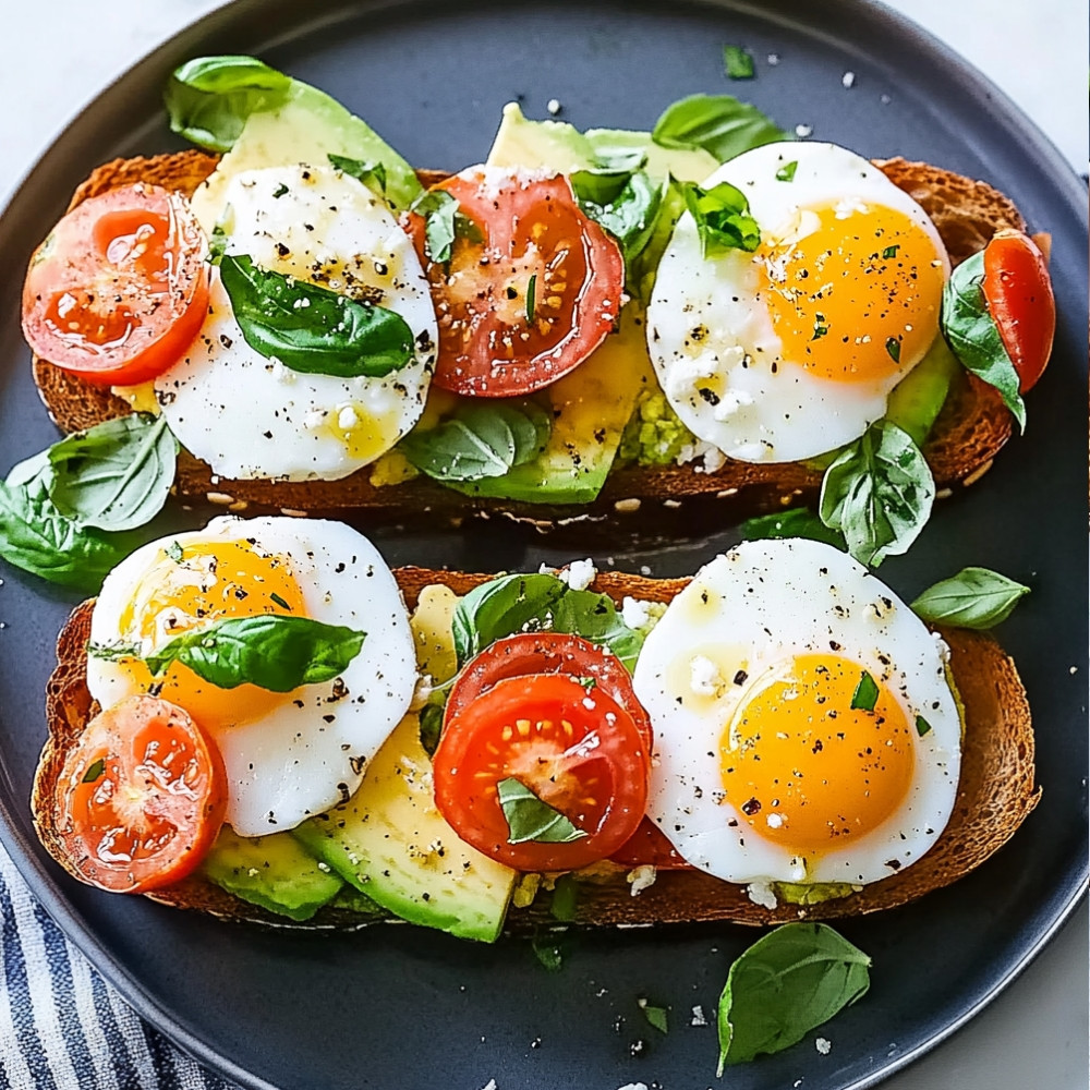 Gently place a cooked egg atop each toast, allowing the yolk to cascade over the tomatoes if it breaks. Optionally, add fresh basil or herbs for extra flavor and serve immediately.