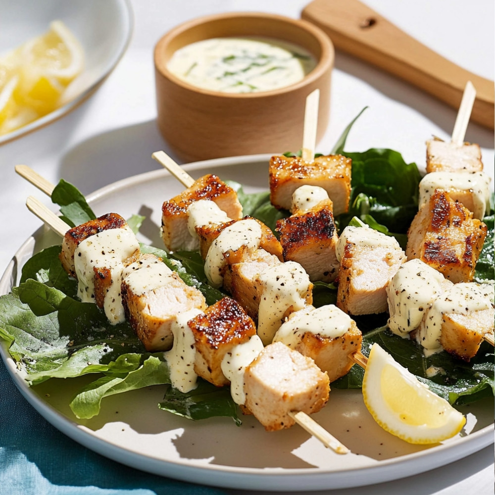 The chicken skewers pair well with a Caesar salad, rice, or grilled vegetables.