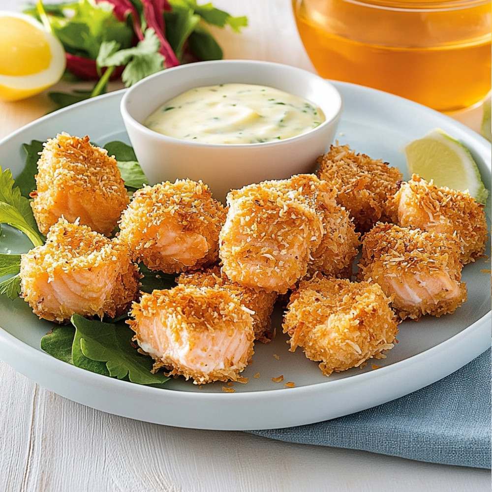 This recipe is simple yet delicious, perfect for a quick midweek dinner or an impressive party appetizer. Enjoy the crunchy coconut coating that pairs beautifully with the succulent salmon!