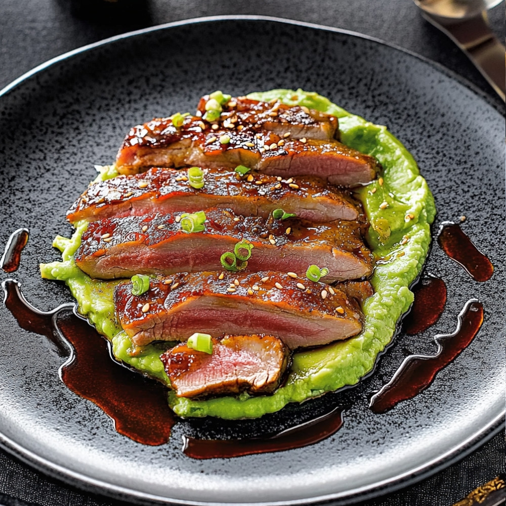 Indulge in a delightful culinary experience with this exquisite recipe for Duck Magret Tataki served on a creamy avocado purée. This dish beautifully combines the rich flavors of duck with the smoothness of avocado, making it a perfect choice for a sophisticated dinner party or a special occasion. With just five ingredients and a short preparation time, you can impress your guests with minimal effort.