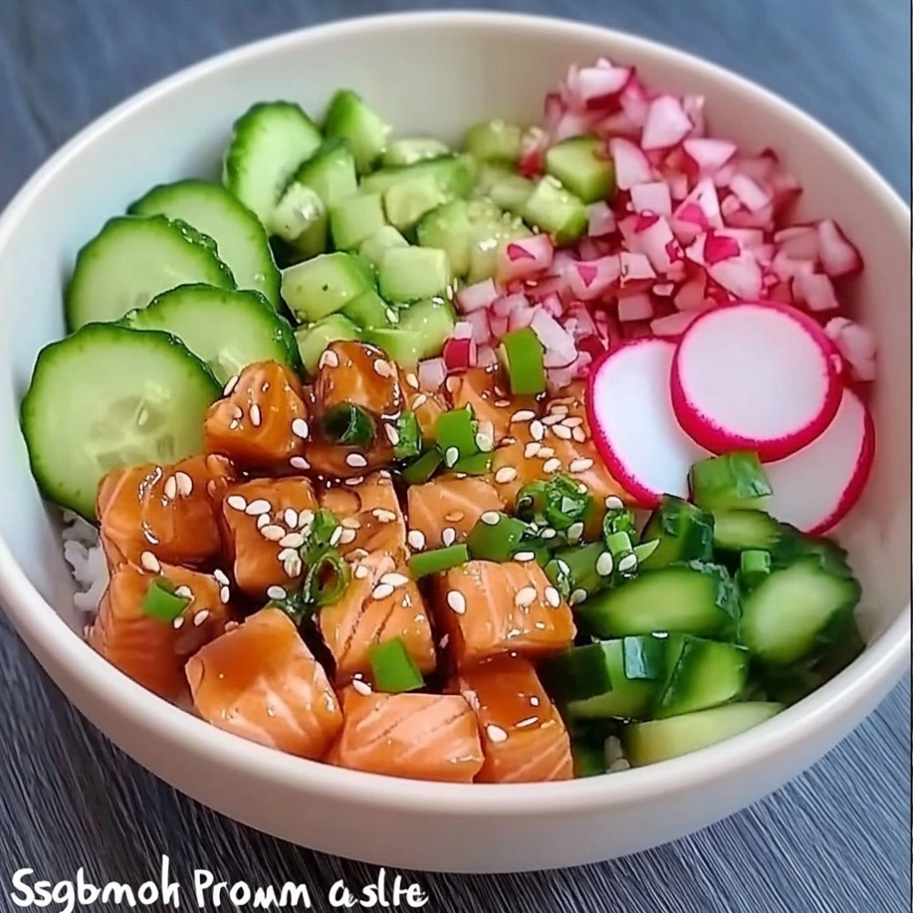 Layer the base with rice, followed by marinated salmon and avocado. Add other toppings like seaweed, radishes, or sesame seeds for texture and flavor.