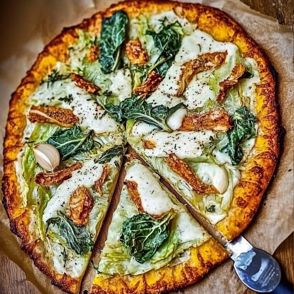 This delicious and innovative pizza is perfect for those seeking a light yet flavorful meal. Enjoy the delightful crunch of the cabbage leaves as a base, complemented by the creamy freshness of the cheese and a touch of garlic.