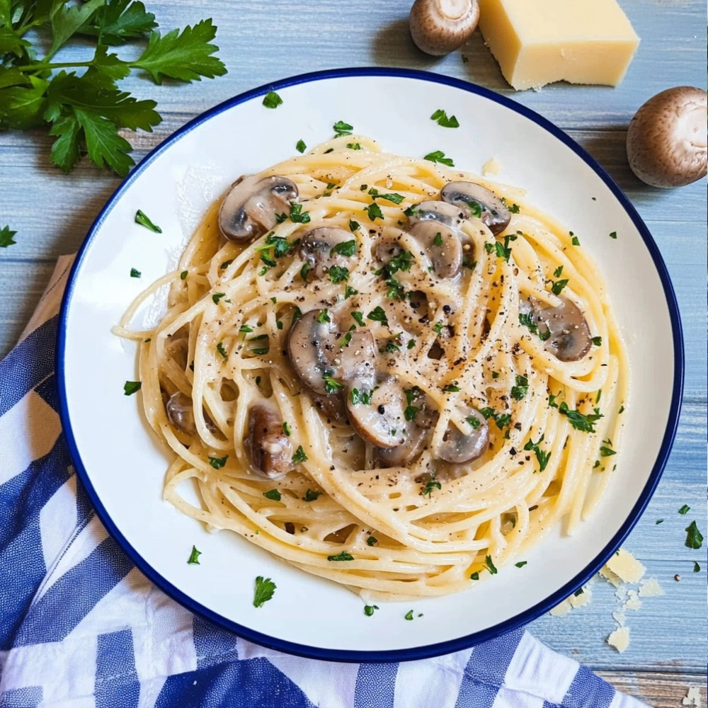 This dish can be served with a side salad or garlic bread to complement the flavors of the pasta and mushrooms.