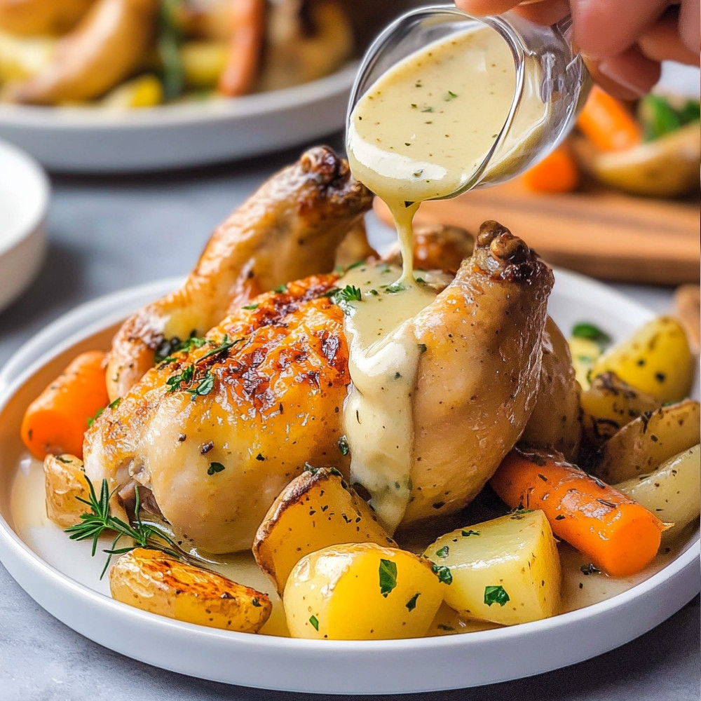 Serve the chicken alongside creamy garlic mashed potatoes for a rich and comforting side that perfectly complements the roast.