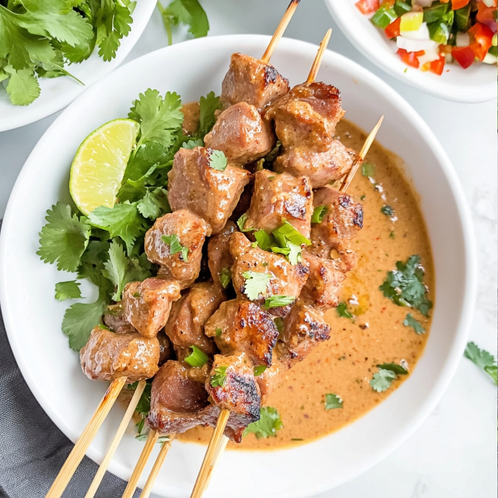 For a vegetarian twist, make Peanut Sauce Tofu Skewers. Marinated tofu grilled to perfection, served with a creamy peanut sauce, offers a delightful alternative to the pork skewers.