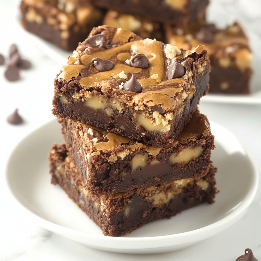 Pour half of the brownie batter into the prepared baking dish. Dollop half of the peanut butter mixture on top, then swirl it gently with a knife. Add the remaining brownie batter and top with the rest of the peanut butter mixture. Swirl again to create a marbled effect.