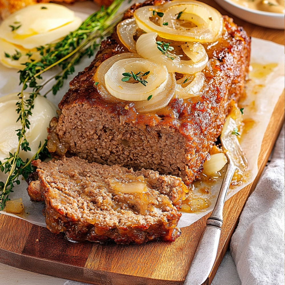 Once the meatloaf is cooked, let it rest for a few minutes. Slice it and serve it topped with the prepared onion soup.