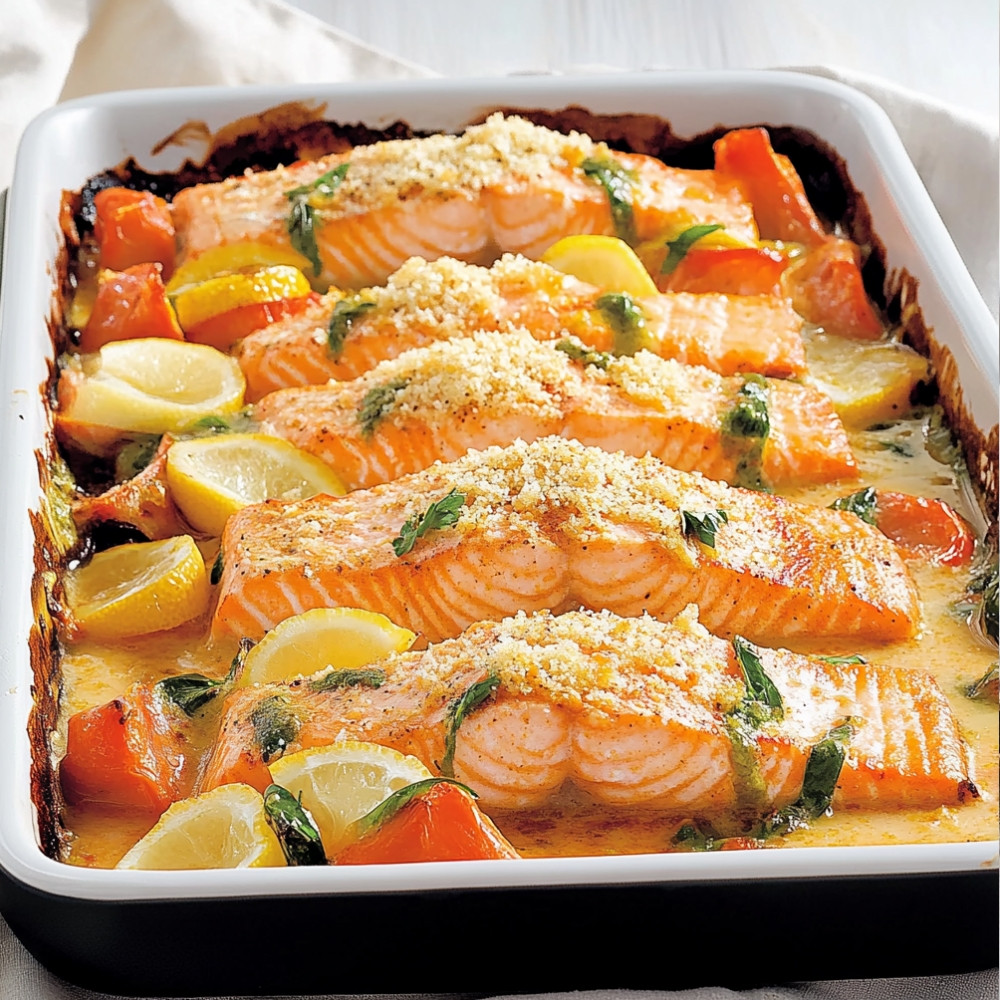 The gratinated salmon on a baking sheet is a delightful and easy dish that showcases the rich flavors of salmon paired with a crunchy topping. This recipe is not only quick to prepare but also versatile, making it a perfect choice for both casual dinners and special occasions. With its appealing presentation and delicious taste, it is sure to impress your family and guests.