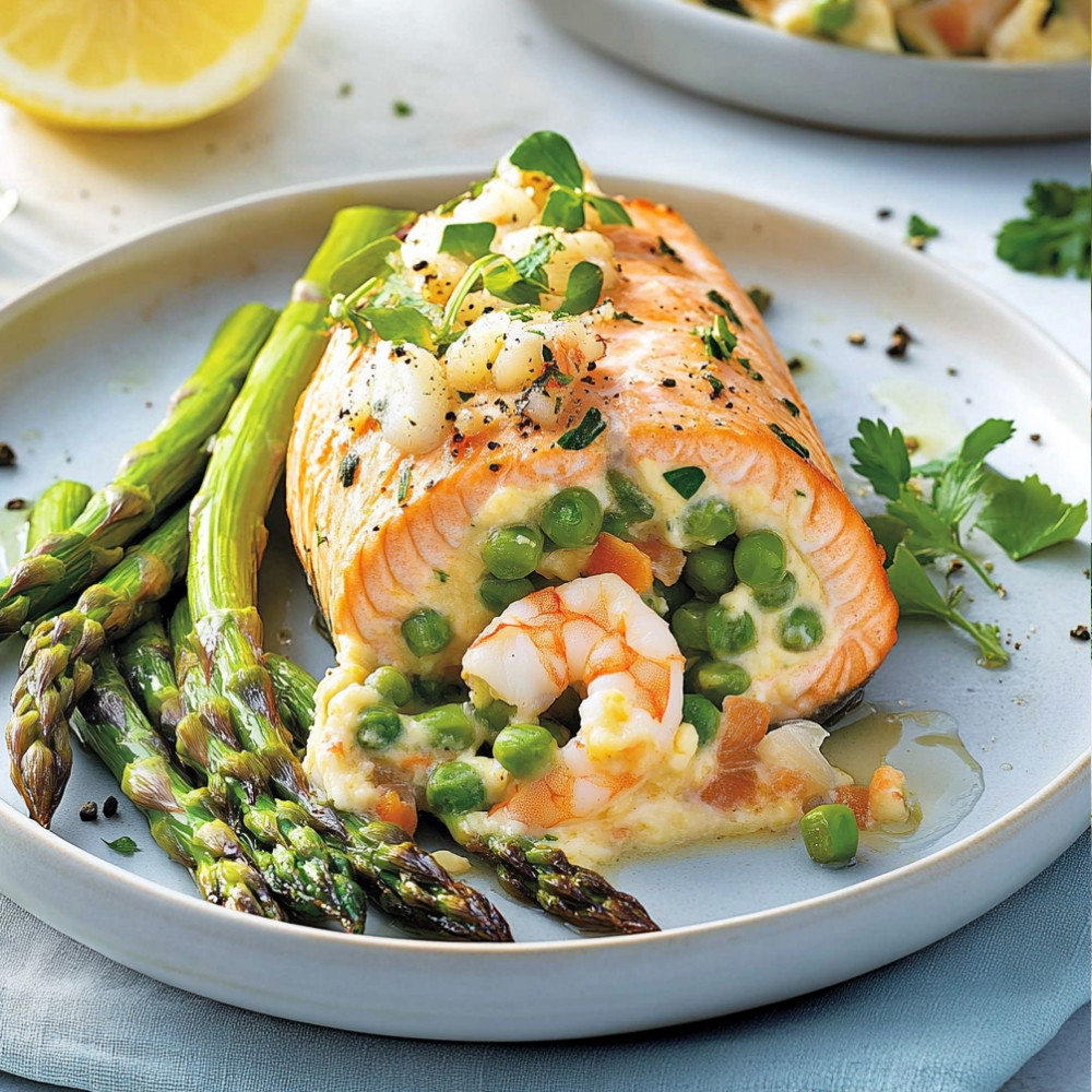 This delicious recipe features salmon stuffed with asparagus, shrimp, and Boursin cheese, resulting in a delightful blend of flavors and textures. It’s a perfect dish for special occasions or a family dinner, combining the richness of salmon with the freshness of vegetables and seafood.
