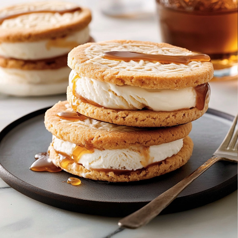 Take two cookies and spread a generous scoop of softened ice cream on the bottom of one cookie. Drizzle the whisky caramel sauce over the ice cream before topping it with the second cookie.