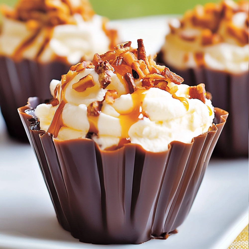 Melt chocolate in a microwave or double boiler until completely smooth. Carefully coat the inside of cupcake liners or silicone molds with the melted chocolate. Make sure to cover evenly for a strong shell. Place them in the refrigerator for about 30 minutes to harden.