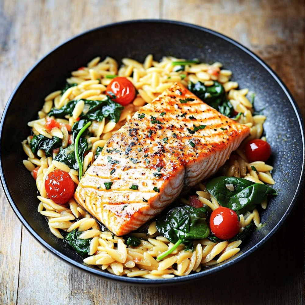 Gently place the salmon back into the skillet on top of the orzo and spinach. Allow it to warm through for a minute.