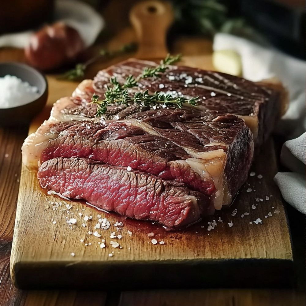 After resting, slice the steak against the grain into thick pieces. Serve immediately, showcasing the rich flavors and tenderness of the dry-aged meat.
