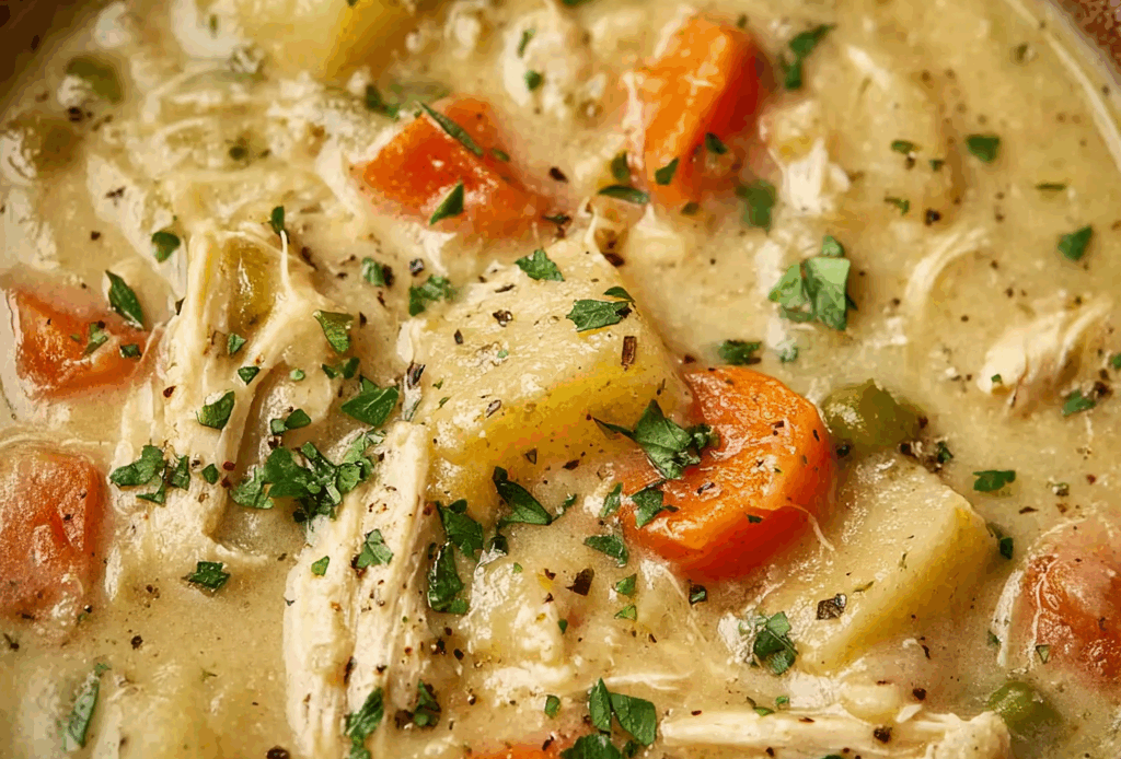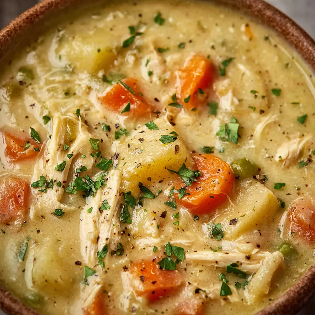 A creamy and comforting soup that captures all the classic flavors of chicken pot pie in a bowl.