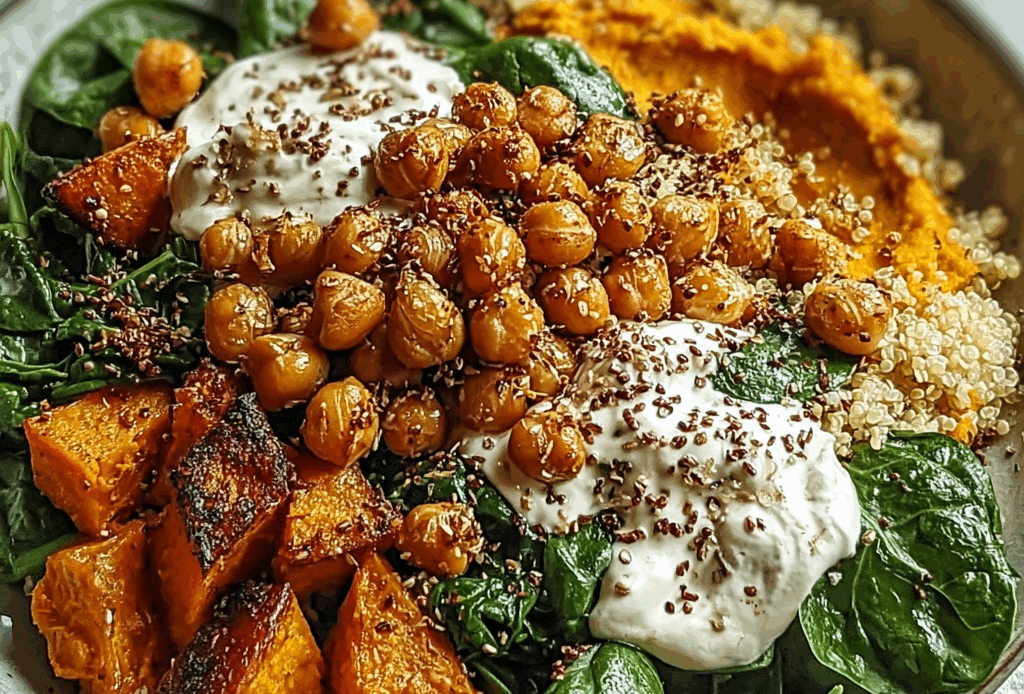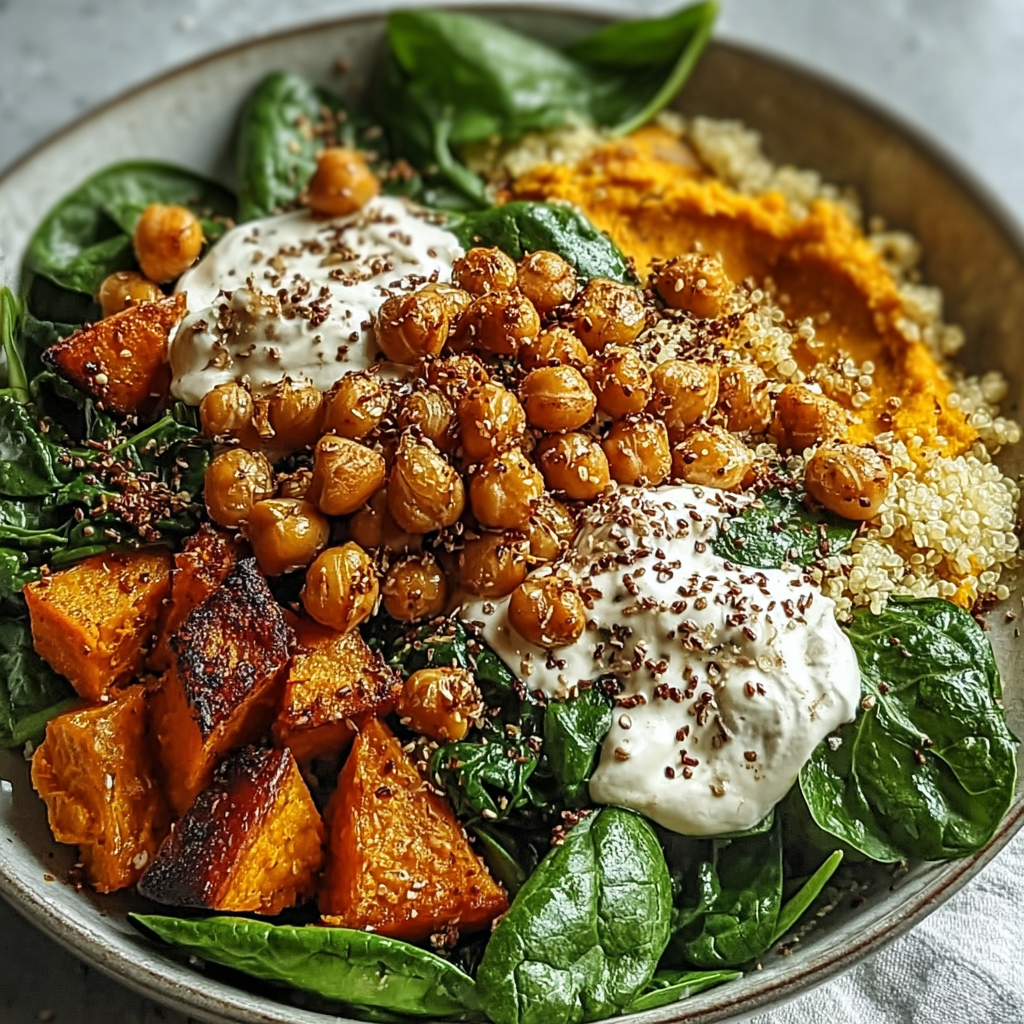 4. Assemble the bowls. Start with a bed of spinach or kale. Add the quinoa, chickpeas, and all the prepared vegetables. Drizzle with the tahini dressing and sprinkle with pumpkin seeds.