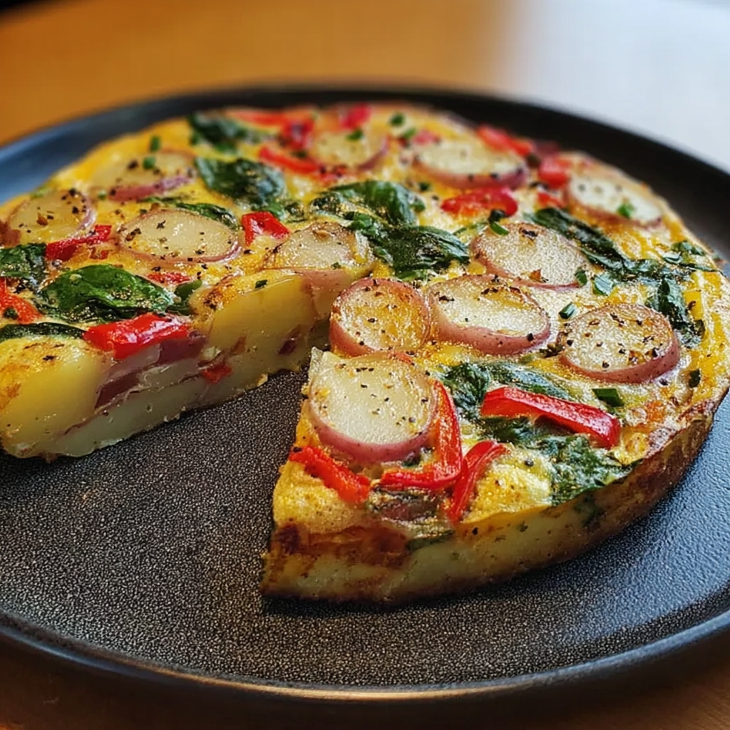 A hearty and versatile frittata packed with tender potatoes, sweet red pepper, and fresh spinach, perfect for any meal of the day.