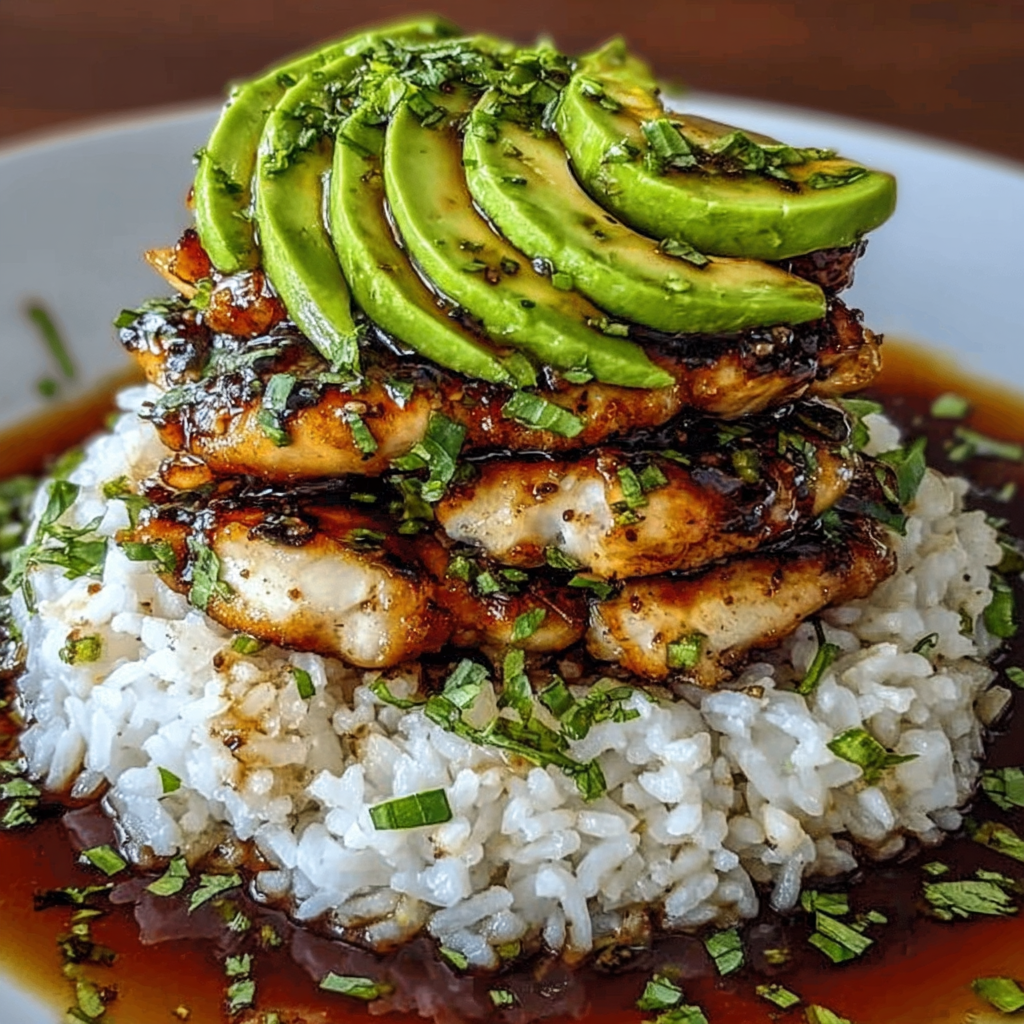 6. To serve, place a scoop of rice on each plate. Top with the saucy sliced chicken and add fresh avocado slices on the side.